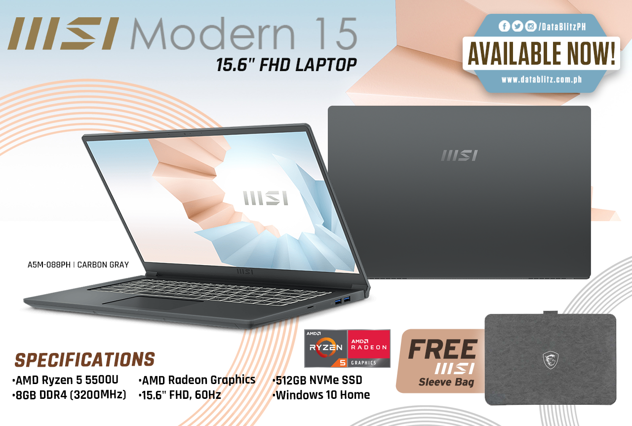 MSi Modern 15 A5M-088PH 15.6" FHD Laptop (Carbon Gray) with Free MSi Sleeve Bag will be available today at DataBlitz branches and E-commerce Site!